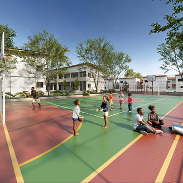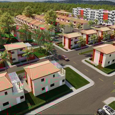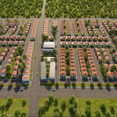 Services : Magasins, espaces verts, aire de jeu, parkings dédiés pour chaque logement, salle de fêtes polyvalente et clôture périphérique de la cité